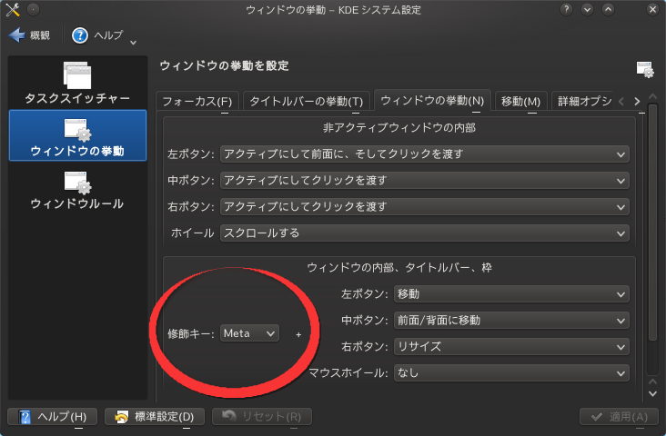 KDEなどのデスクトップ環境で優先されているウインドウマネージャのAlt+Click設定を変更する。