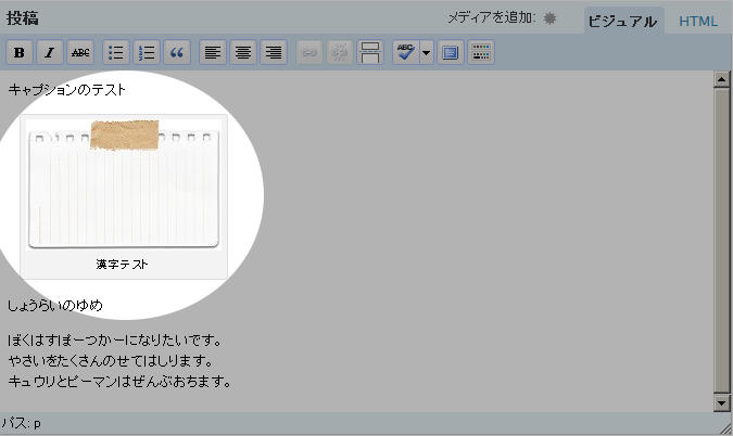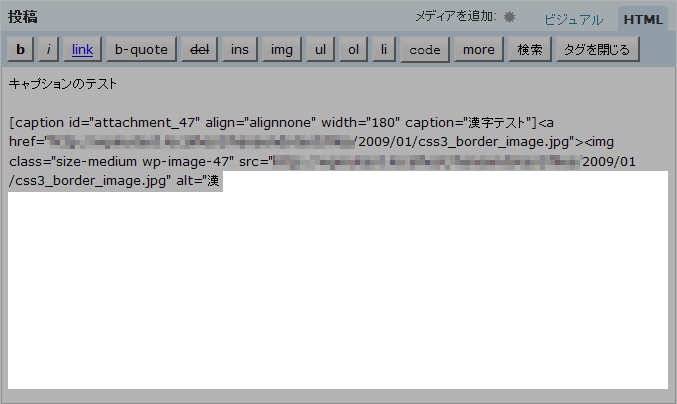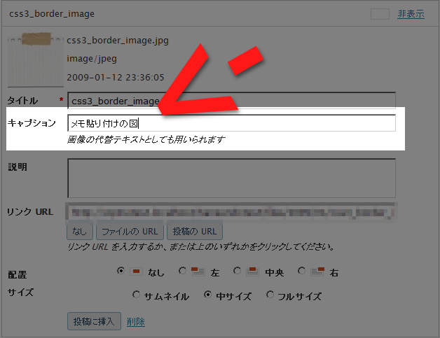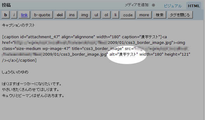 WordPress(MU2.6.5で実験)では記事内に画像を挿入するとき、キャプション欄に設定したテキストがimgタグのaltに指定されます。