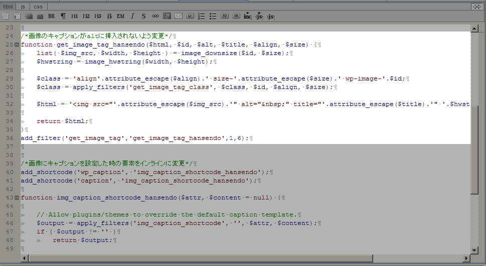 ついでに、キャプションのショートコードも再定義して、divとpをspanに変更してみたんですが、後でdisplayにblockを指定したのであんまり意味がなかったです。